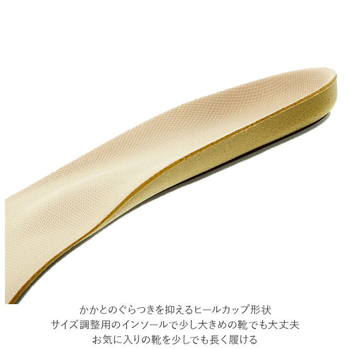 ・かかとのぐらつきを抑えるヒールカップ形状。サイズ調整用のインソールで少し大きめの靴でも大丈夫!お気に入りの靴を少しでも長く履ける。