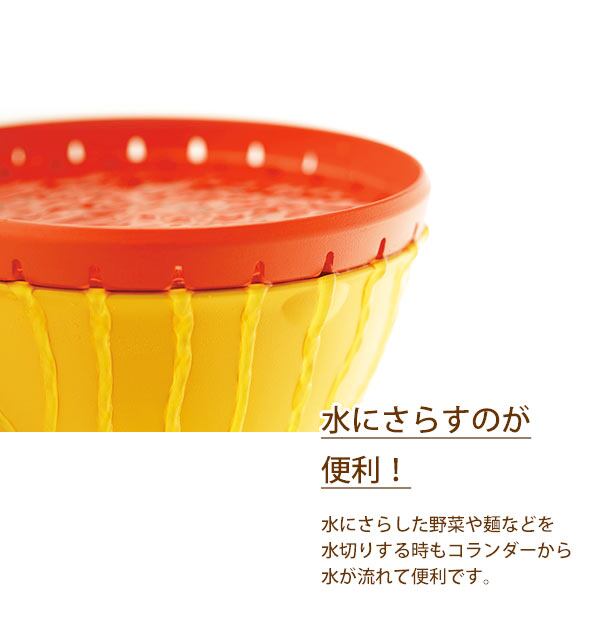 ボールとコランダーを重ねて使うとコランダーの穴から水が流れ、オーバーフローを防ぎます。切った野菜や茹でた麺などを流水にさらす時などに便利です。