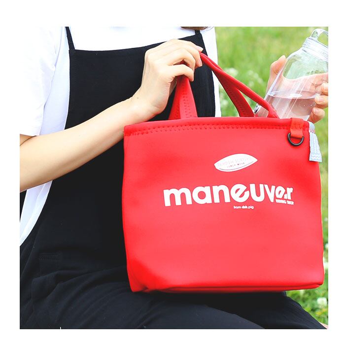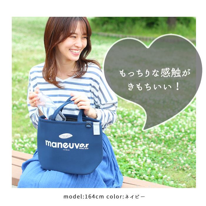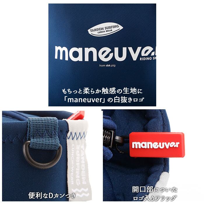 ・もちっと柔らか触感の生地に「maneuver」の白抜きロゴをスタイリッシュに配置し、開口部についたロゴ入りフラッグやDカンがデザインのワンポイントに!