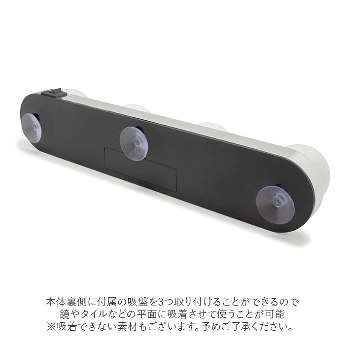 ・本体裏側に付属の吸盤を3つ取り付けることができるので、鏡やタイルなどの平面に吸着させて使うことが可能。(※吸着できない素材もございます。予めご了承ください。)
