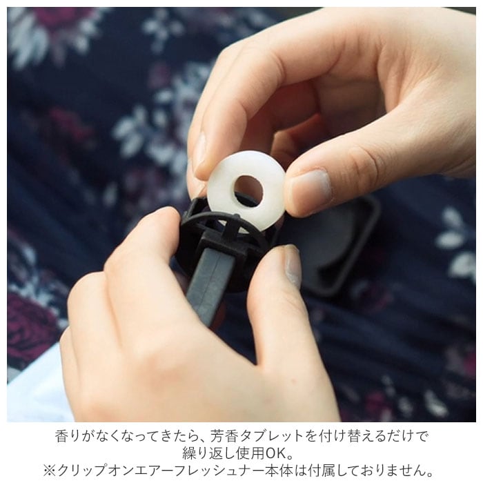 ・クリップオンエアーフレッシュナーは、新鮮なアロマを凝縮したクリップ型のカーフレグランス。香りがなくなってきたら、芳香タブレットを付け替えるだけで、繰り返し使用OK。