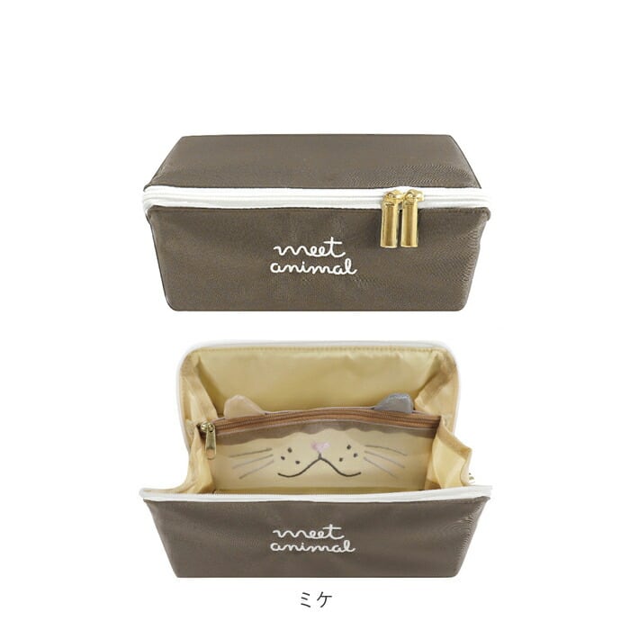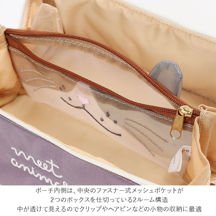 ・メッシュ式ファスナーポケットは、ほっこり癒されるアニマルのお顔モチーフ。中が透けて見えるので、クリップやヘアピンなどの小物の収納に最適。