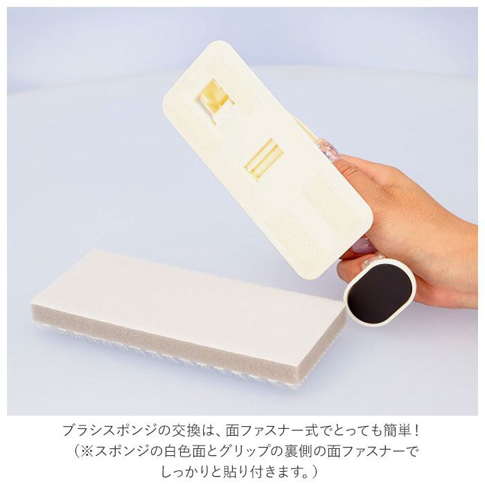 ・ブラシスポンジの交換は、面ファスナー式でとっても簡単!(※スポンジの白色面とグリップの裏側の面ファスナーでしっかりと貼り付きます。)