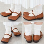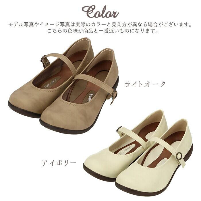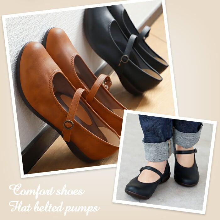 ・柔らかくて素材感のあるフェイクレザーと、つま先が丸みを帯びた可愛らしいフォルムが印象的。ヒールが高くなくて歩きやすい、フラットタイプのワンベルトパンプス。