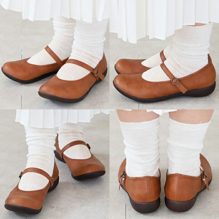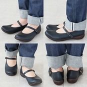 ・足の甲にルーズめに掛かる細めのベルトは、スナップボタン式で脱ぎ履きがラクチン。5段階のベルト穴付きで、自分の足の高さに合わせて調節が可能!ベルト根元がゴムになっているため、足の微妙な動きに対応。
