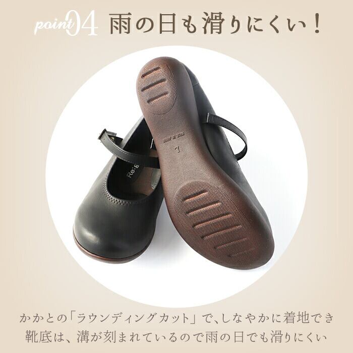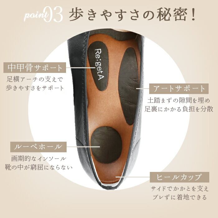 ・Re:getA(リゲッタ)の深みのあるブラウンのアウトソールが、理想的な歩き方に導いてくれる♪つま先が反りあがったローリングカットで、つま先に少し力を入れるだけでスイスイ進めて、かかとのラウンディングカットでかかとからしなやかに着地できる!