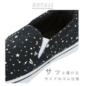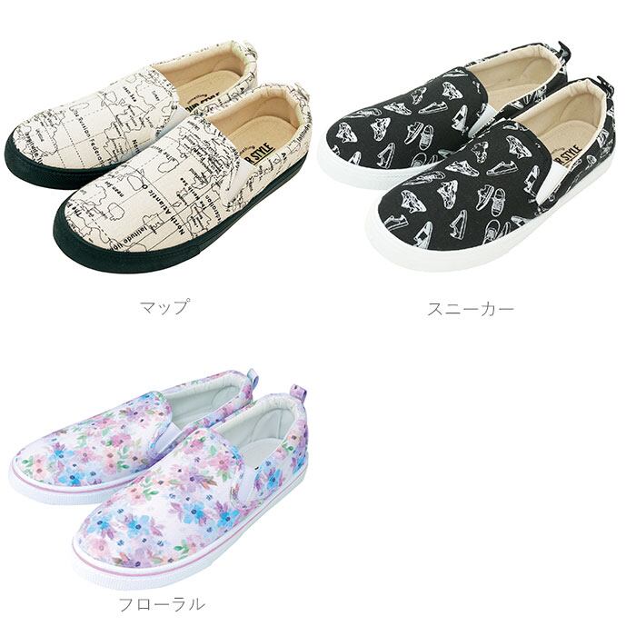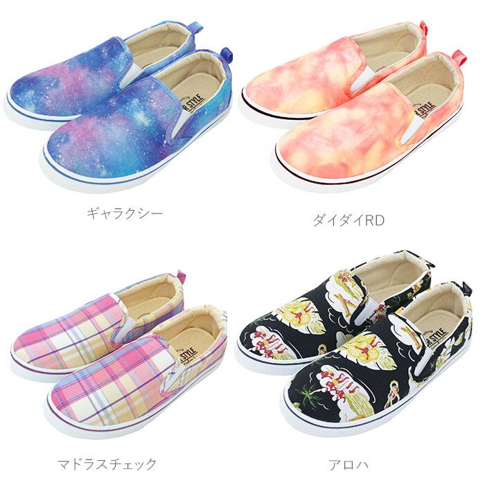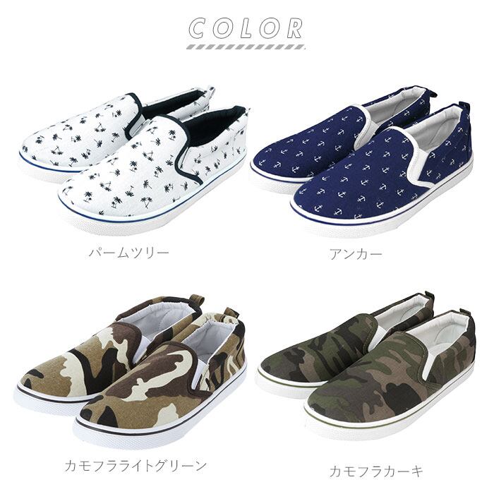 ・ボーイズライクなカモフラージュ柄に、星やパームツリー・アンカー(錨・いかり)などの可愛いテキスタイルが個性的なスリッポン。