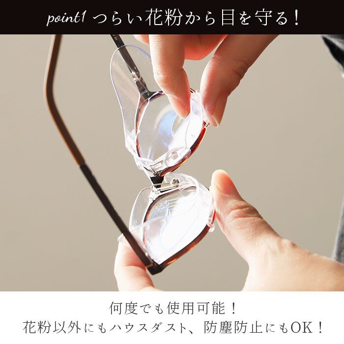 ・ご自身のメガネに直接取り付けて花粉を防止、スカッシー「メガネにカバー」。