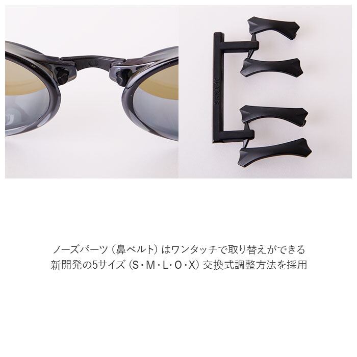 ・5段階のノーズパーツにより、高いフィット感を実現。ノーズパーツ(鼻ベルト)は、ワンタッチで取り替えができる、新開発の5サイズ(S・M・L・O・X)交換式調整方法を採用。