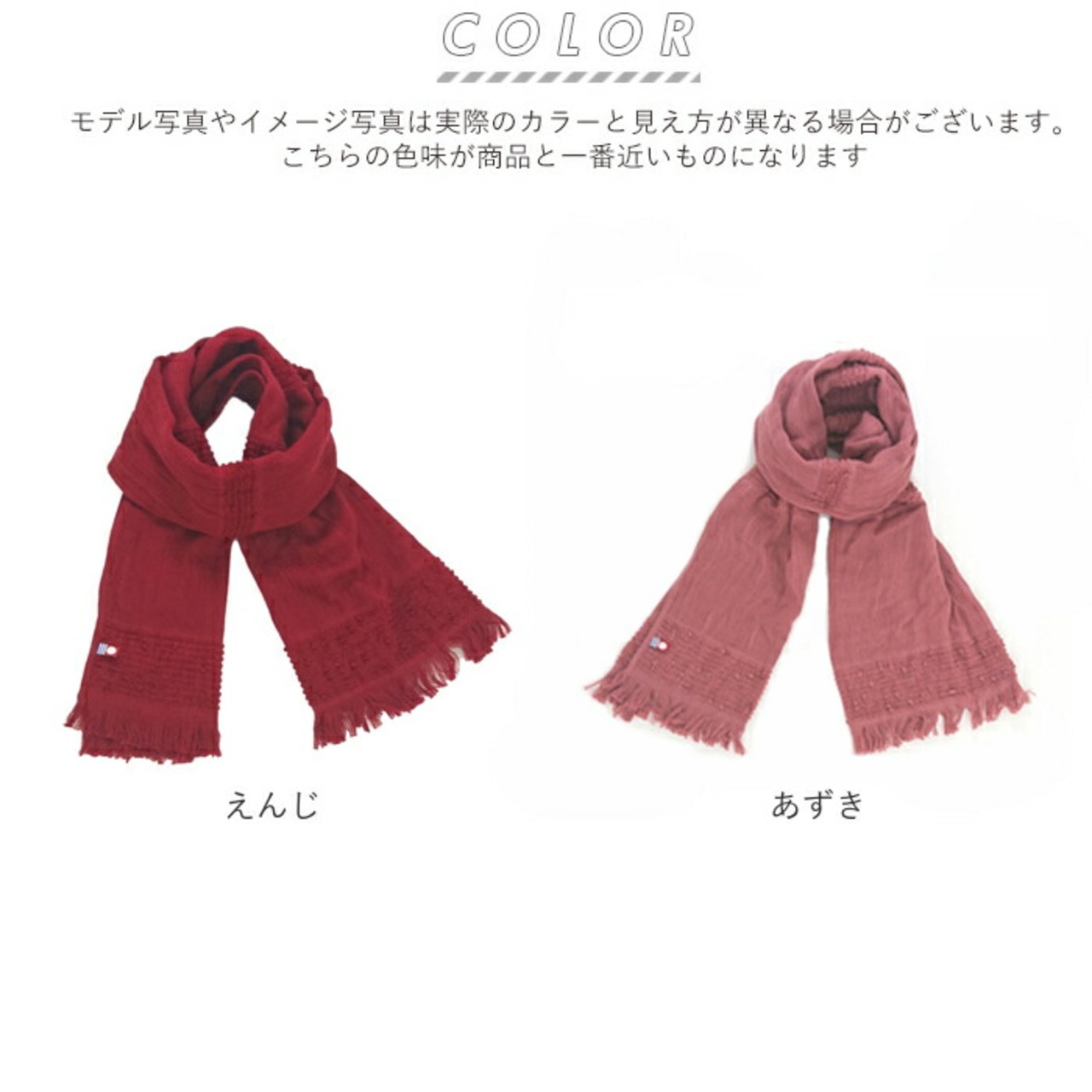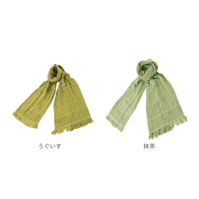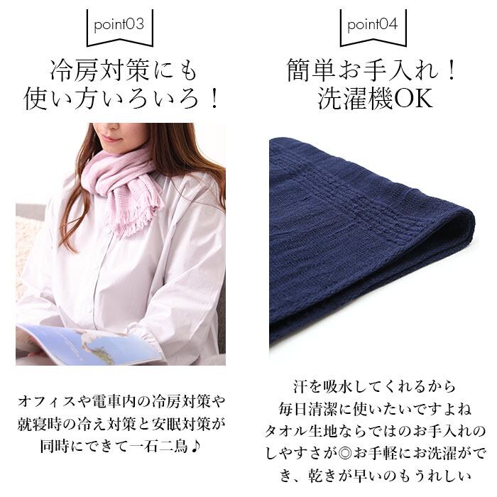・肌寒さを感じる季節はもちろん、吸水性や吸汗性にも優れているので、紫外線の気になる汗ばむ季節でもストール代わりにふわっと羽織れるオールシーズン仕様。