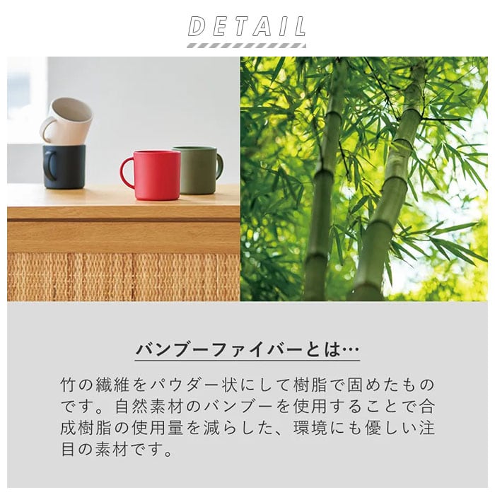 ・バンブーファイバーとは、竹の繊維をパウダー状にして固めたもの。自然素材の竹を混ぜ込むことで合成樹脂の使用量を減らした、環境に優しいエコ素材!