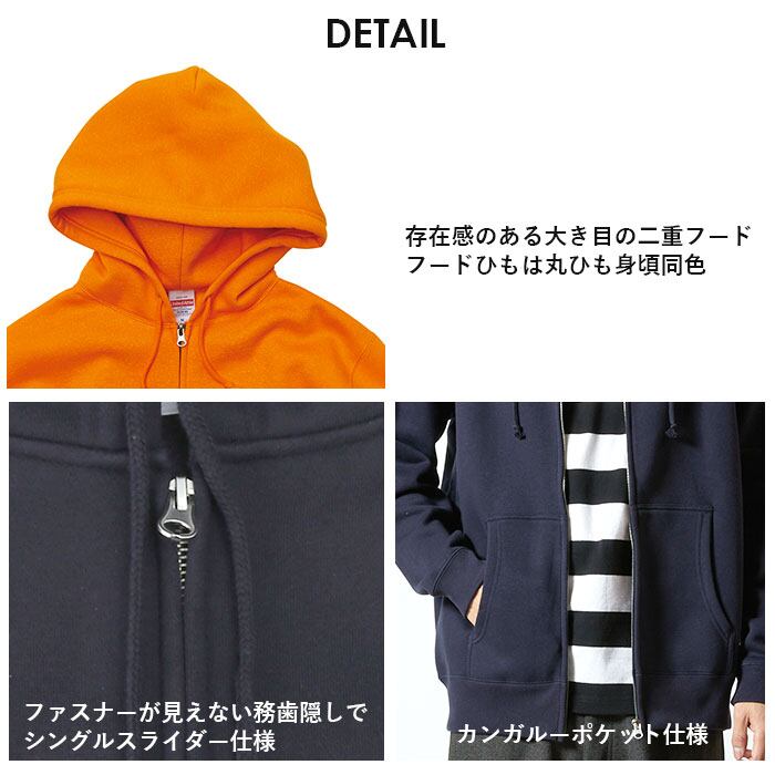 ・裏地はふかふかで保温性の高い裏起毛にしながら、綿とポリエステルの生地にすることで軽くて丈夫なパーカに仕上がっている。