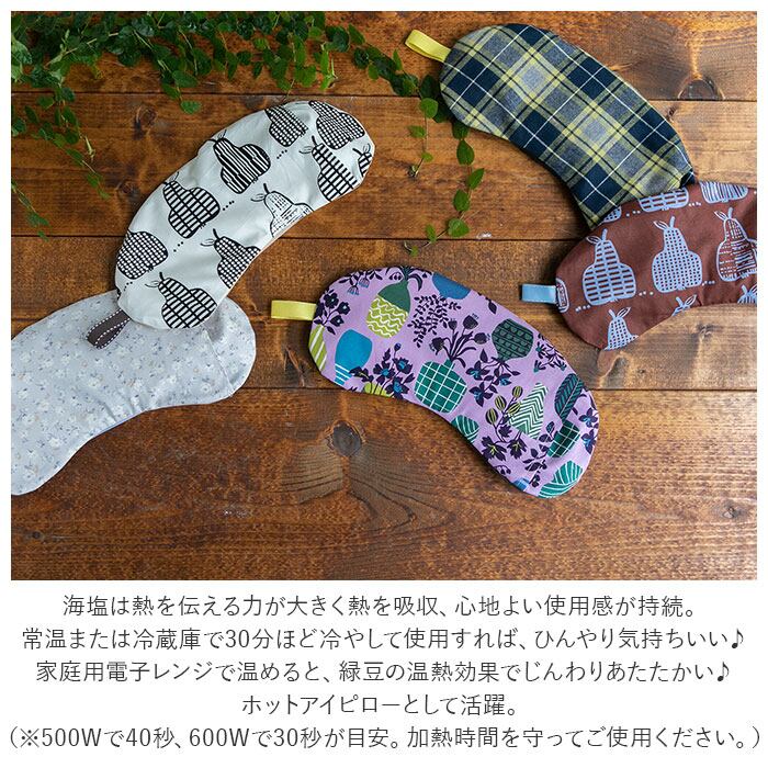・家庭用電子レンジで温めると、緑豆の温熱効果でじんわりあたたかい♪ホットアイピローとして活躍。(※500Wで40秒、600Wで30秒が目安。加熱時間を守ってご使用ください。)