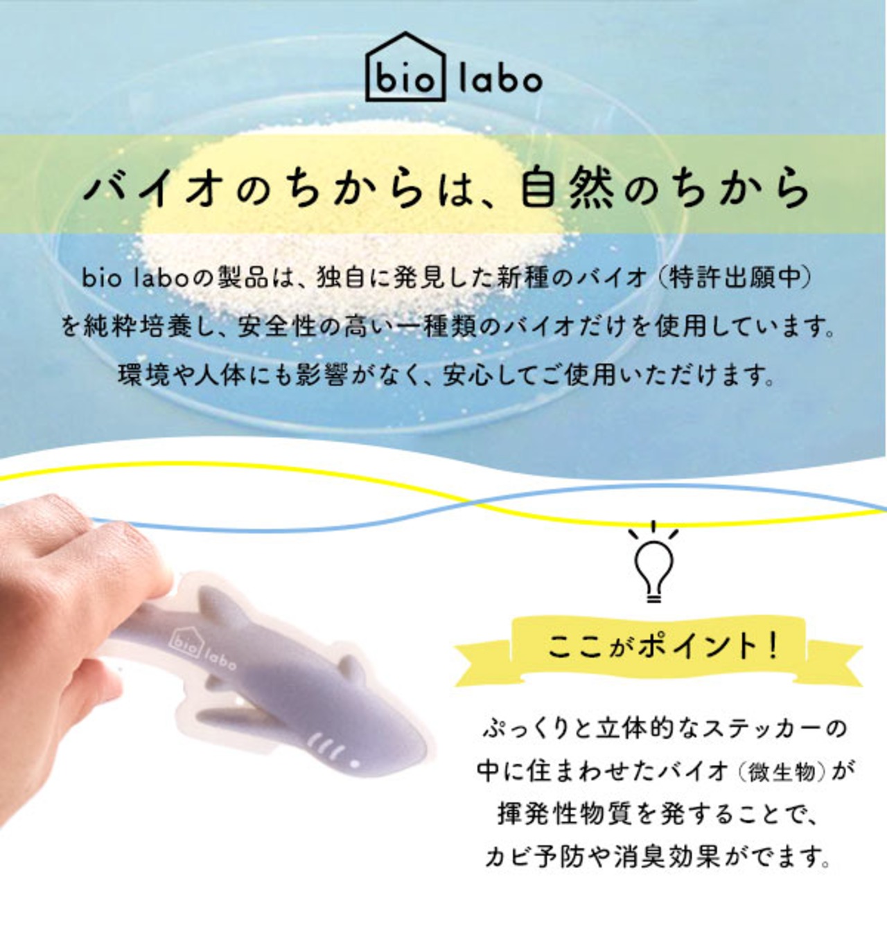 立体ステッカーの中に住まわせたバイオ(微生物)がカビを抑制する揮発性物質を発することでステッカーを貼った場所周辺にカビが生えにくくなります。また、このバイオが発する揮発性物質は消臭効果もありますので、ニオイの発生源となる場所や水回りなどに貼っていただくと効果的です。
