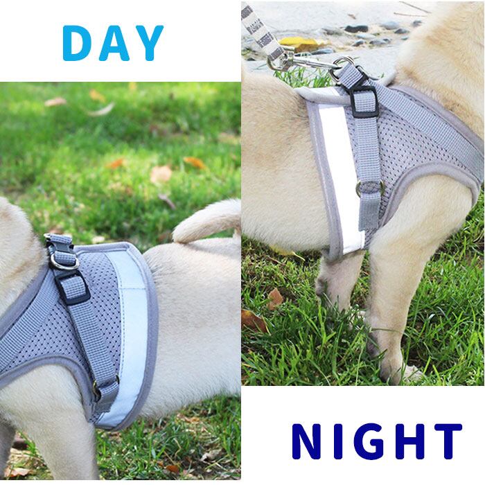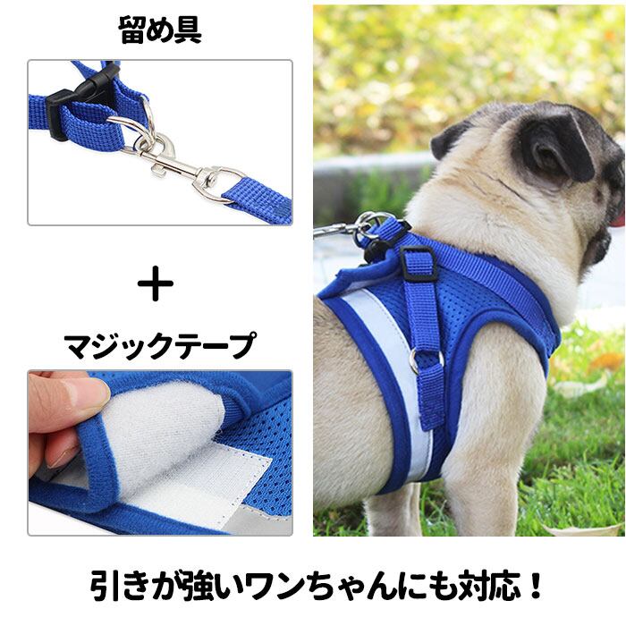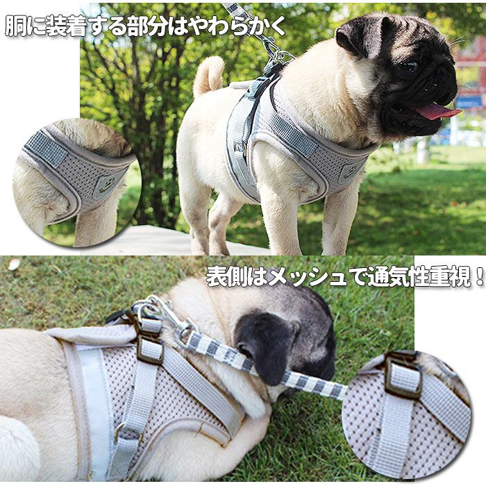 ・胴に装着する部分はやわらかく、表側はメッシュになっているので、ワンちゃんへの負担を軽減。マジックテープと留め具が2つ付いているので引きが強いワンちゃんにも対応!
