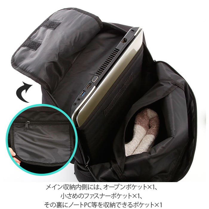 ・メイン収納内側には、フロント側に大きめのオープンポケット×1、背面側には、小さめのファスナーポケット×1と、その裏にマジックテープで開閉できるポケット×1。クッション性のあるポケットなので、ノートPCなどの収納も可能。