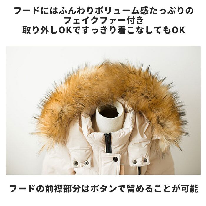 ・フードにはふんわりボリューム感たっぷりのフェイクファー付き。柔らかな手ざわりに、温かみのある贅沢な風合い。フードの前襟部分はボタンで留めることが可能。