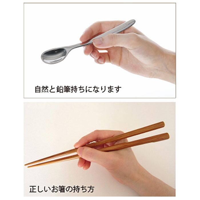 ・幼児の口の形状や大きさなどに沿ったユニバーサルデザインの考えに基づいたオリジナルデザイン。「こぼさず」「口まで運びやすく」「吐き出さず」「嫌がらず」「食べることが楽しくなる」ようにつくられたオリジナル設計。
