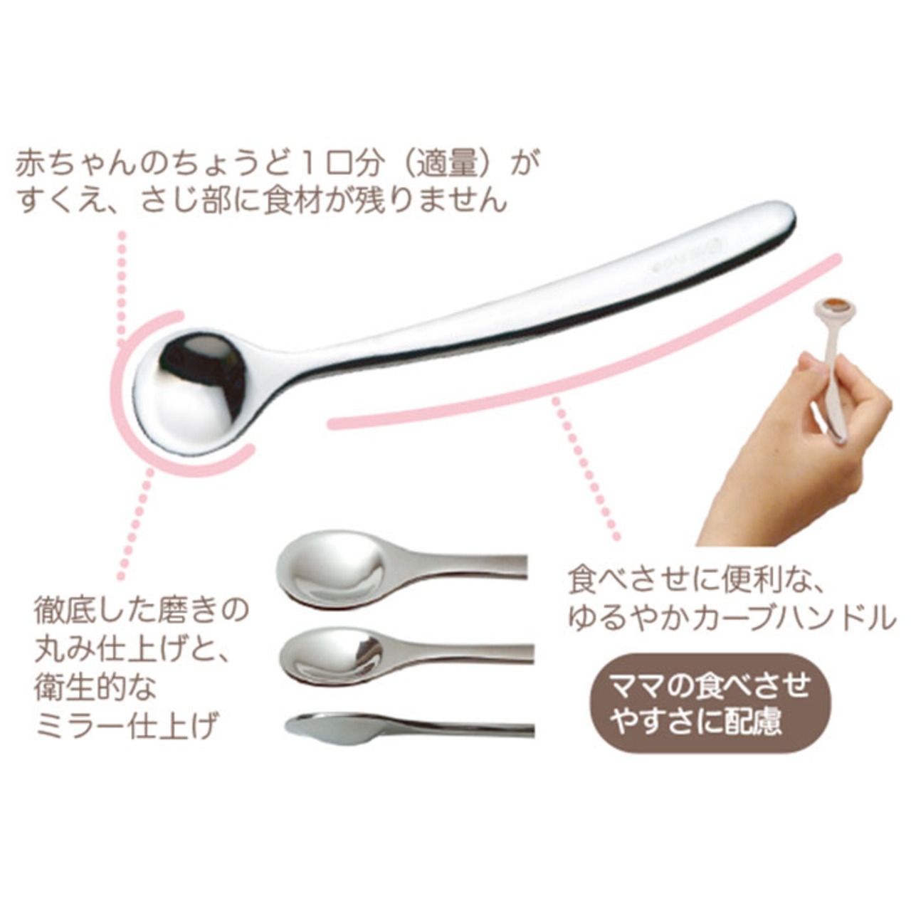 ・赤ちゃんの一口サイズに設計されて、お口にすっと入る円形&浅底サジ。持ちやすいカーブハンドル。やさしい先端丸み設計で口当たり滑らかなフチ付き。