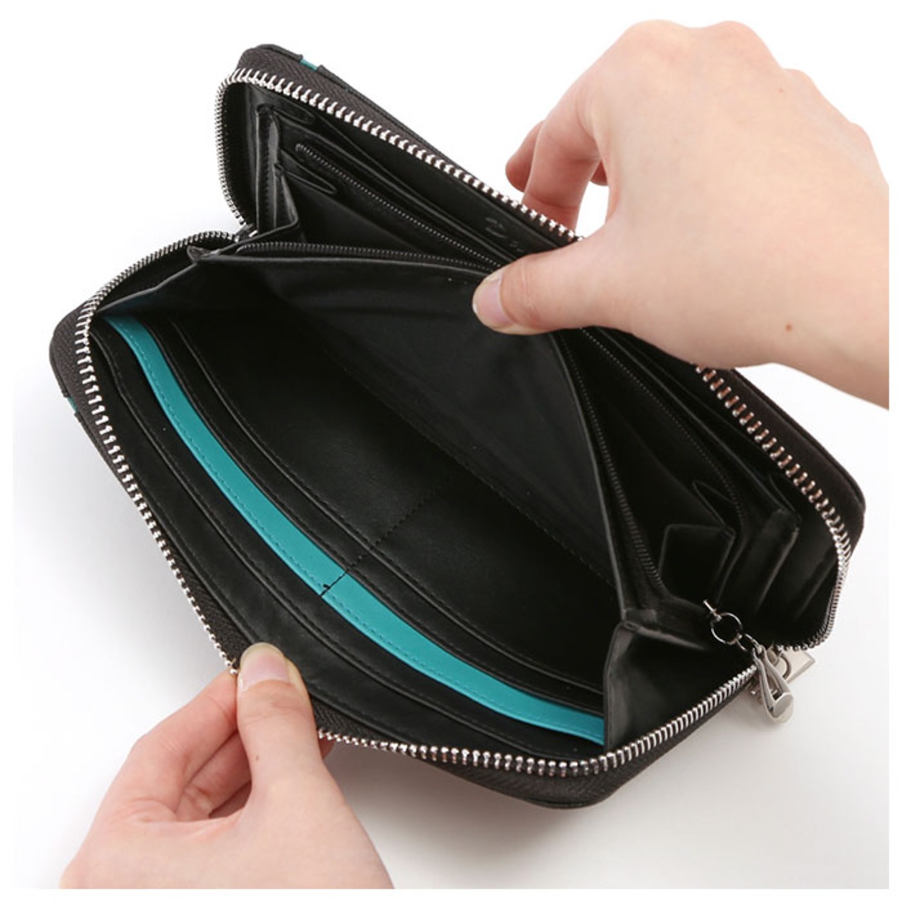 ・高級感のあるフェイクレザーを使用した人気のラウンドジップタイプ。