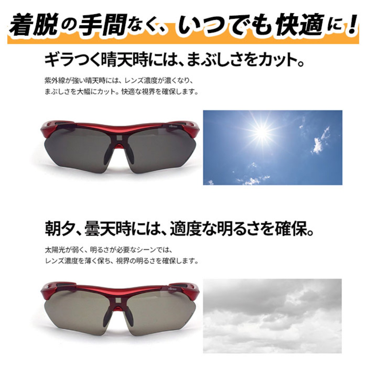 ・偏光機能+調光機能で、サングラスのかけ外しの手間なくいつでも快適な視界。ellesseの偏光調光サングラス。