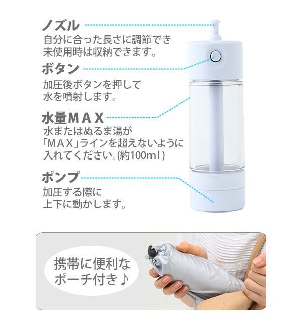 加圧して水を出すのでまるで自宅気分でおしりを洗うことができる携帯用洗浄器です。