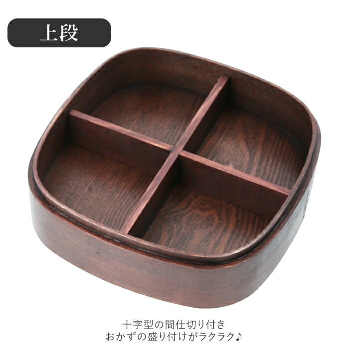 ・和の風格と可愛らしさを併せ持つ「曲げわっぱ」漆塗り二段重箱。幅21.5cm × 奥行21.5cmサイズでたっぷり入る!