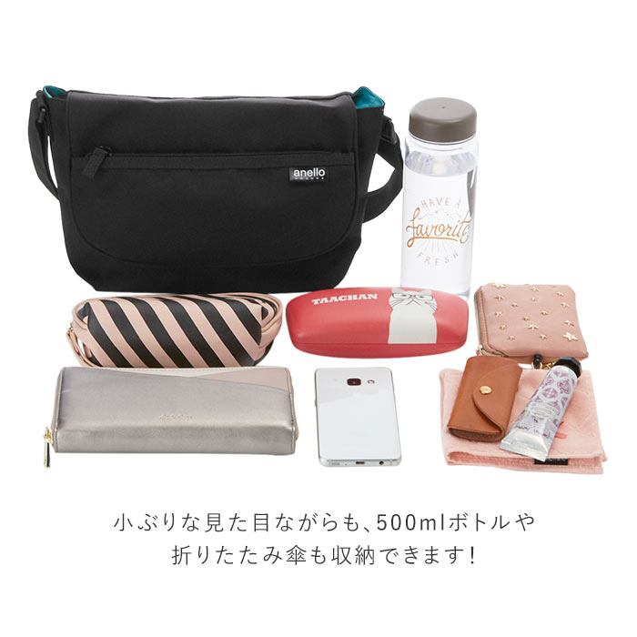 ・小ぶりな見た目ながらも、500mlペットボトルや折りたたみ傘も収納できる程よいサイズ感。ちょっとしたお出かけにぴったり。