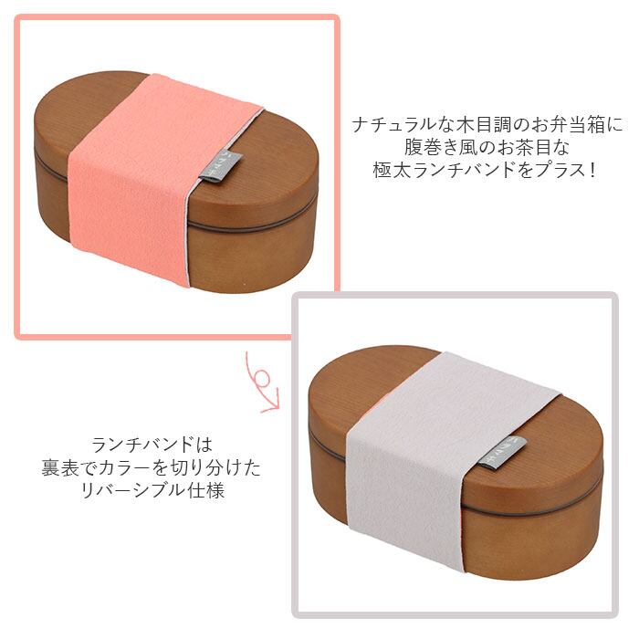 ・ナチュラルな木目調のお弁当箱に、腹巻き風のお茶目な極太ランチバンドをプラス!どことなく懐かしくて、個性的なフォルムが可愛いらしい。