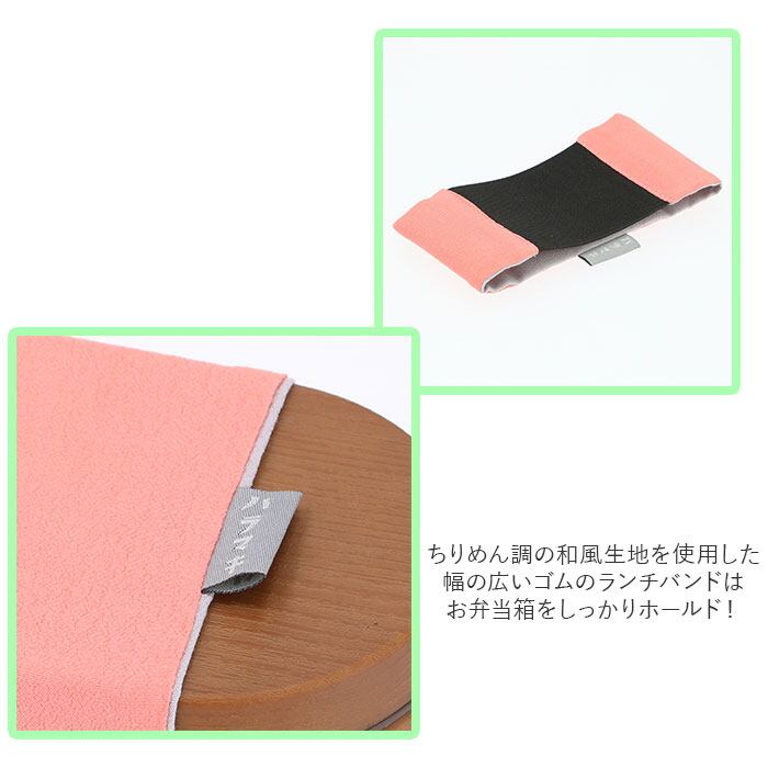 ・ちりめん調の和風生地を使用したランチバンドは、幅の広いゴムでお弁当箱をしっかりホールド!フタが外れる心配ナシ。
