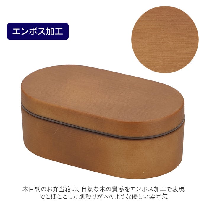 ・木目調のお弁当箱は、自然な木の質感をエンボス加工で表現。でこぼことした肌触りが木のような優しい雰囲気。