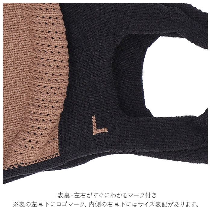 ・表裏・左右がすぐにわかるマーク付き。(表の左耳下にロゴマーク、内側の右耳下にはサイズ表記があります。)