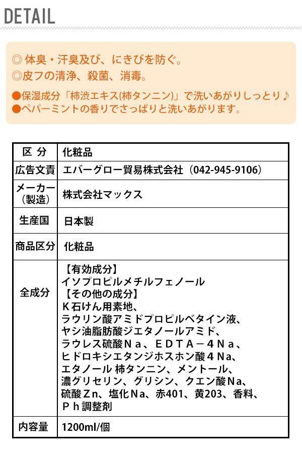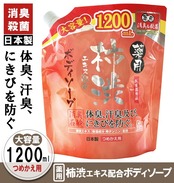 「薬用 柿渋エキス配合 ボディソープ 詰替 1.2L」は、柿渋エキス(柿タンニン)配合のボディソープです。殺菌成分イソプロピルメチルフェノール配合で、皮フの洗浄、殺菌、消毒をし、体臭を防ぎます。ペパーミントの香り。医薬部外品。