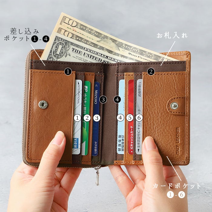 ・札入れ×1、差し込みポケット×4、カードポケット×6、小銭入れの中にも差し込みポケット×2と、充実の収納力。