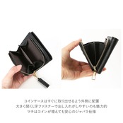 ・コインケースはすぐに取り出せるよう外側に配置。大きく開くL字ファスナーで出し入れがしやすいのも魅力的。マチはコインが増えても安心のジャバラ仕様。