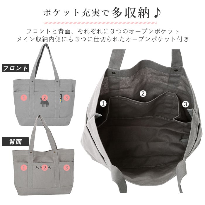 ・フロントと背面、それぞれに3つのオープンポケット付き。持ち手のテープ生地で仕切られた構造で、スマートフォン、文庫本、ハンカチなど、色々自分好みにしまえちゃう!