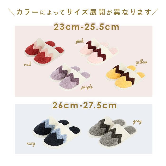 ・ポップなカラーと快適な履き心地は、おうち時間をより楽しくしてくれる♪(※サイズにより、カラーのラインナップが異なります。23cm〜25.5cmまでは、レッド・ピンク・パープル・イエローのポップな4色。26cm〜27.5cmまでは、シックなグレー・ネイビーの2色展開となります。)