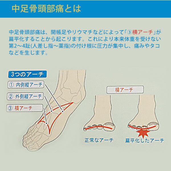 医療現場の技術で、開張足やリウマチからくる中足骨頭部痛をサポートします。