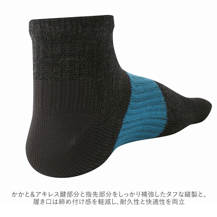 ・かかと&アキレス腱部分と指先部分をしっかり補強したタフな縫製と、履き口は締め付け感を軽減し、耐久性と快適性を両立。