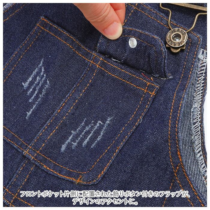 ・ほんのりダメージデザインを施したオーバーオール。(※デザインには個体差があります。)