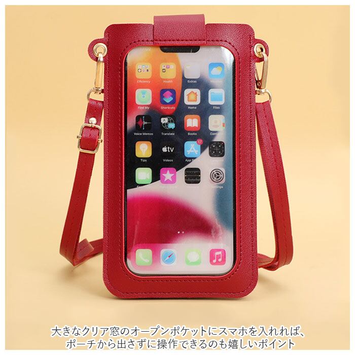 ・大きなクリア窓のオープンポケットにスマホを入れれば、ポーチから出さずに操作できるのも嬉しいポイント。