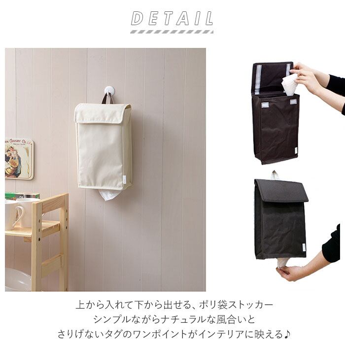 ・上から入れて下から出せる、ポリ袋ストッカー。シンプルながらナチュラルな風合いとさりげないタグのワンポイントがインテリアに映える♪