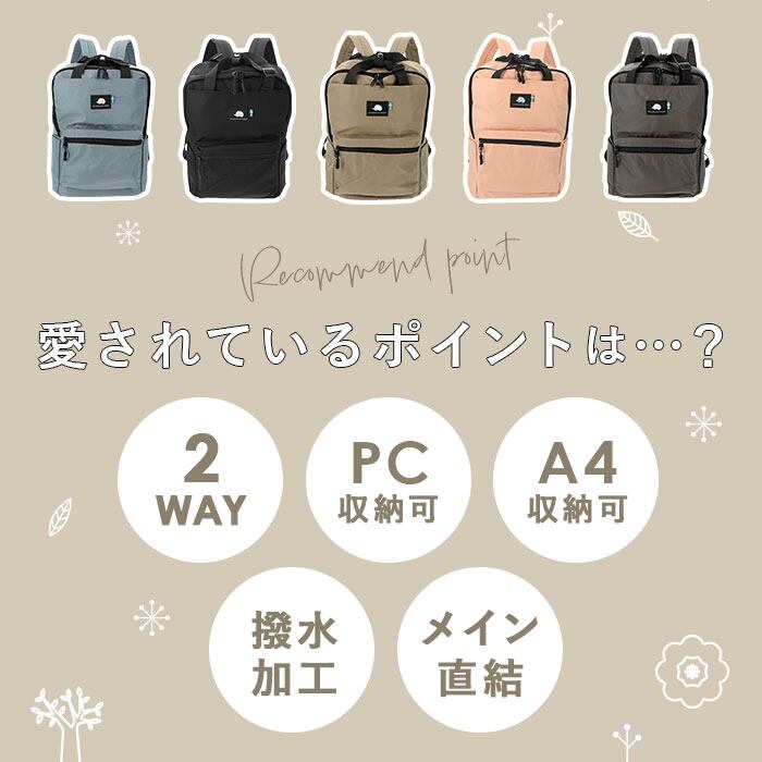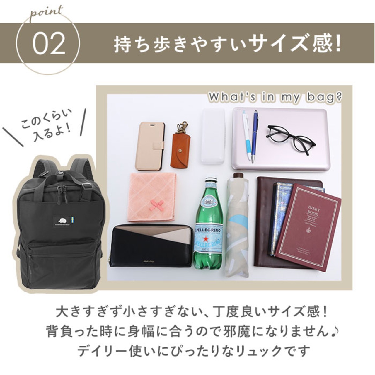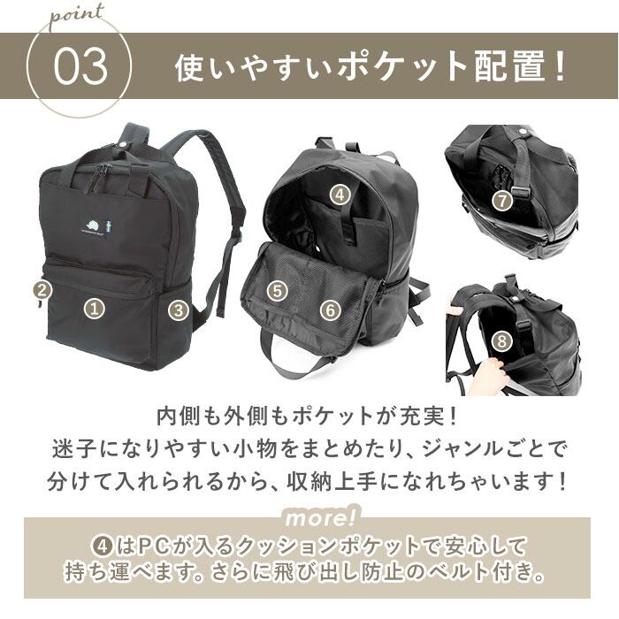 ・前面と背面にオープンポケット×1、前面にファスナーポケット×1、両サイドにオープンポケット×2を装備。沢山物を入れられるから、荷物が多くなりやすい通勤通学時におススメのリュック。