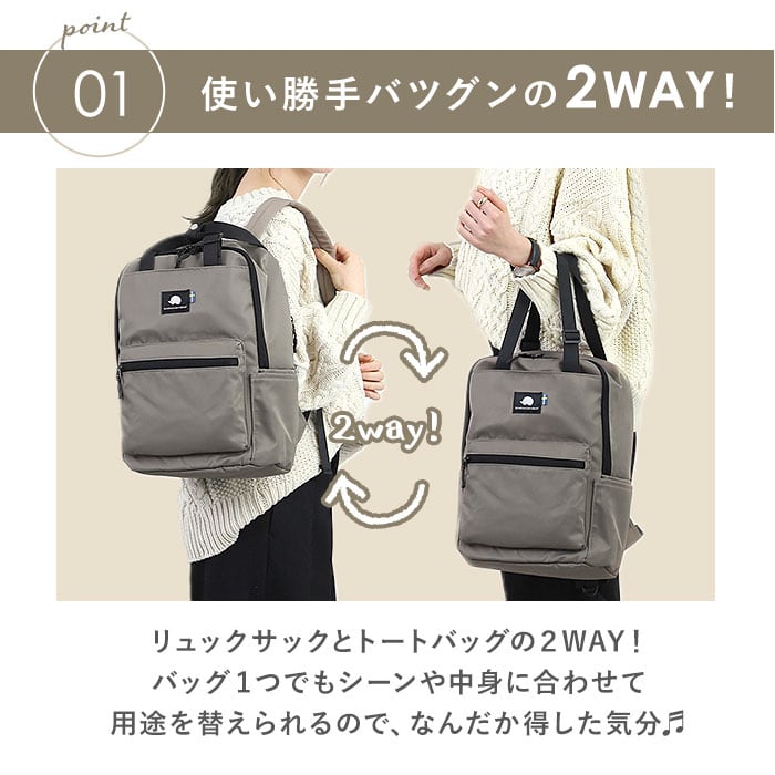 ・表生地には厚手ではっ水加工が施された高密度ナイロン素材を使用。トートスタイルで肩掛けにするときも軽量で持ち運びラクチン。