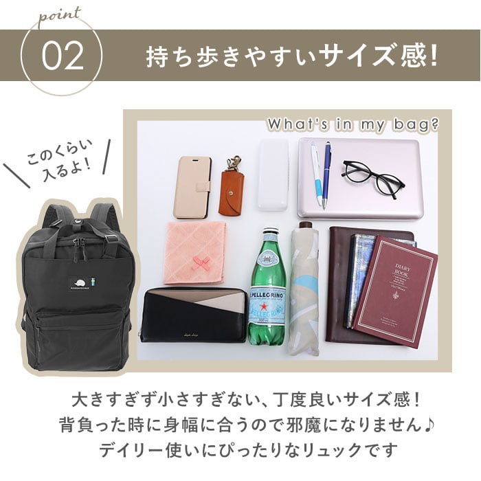 ・背面にメインルーム直結ファスナー付きなので、背負ったまま片手で財布などを取り出せて便利♪