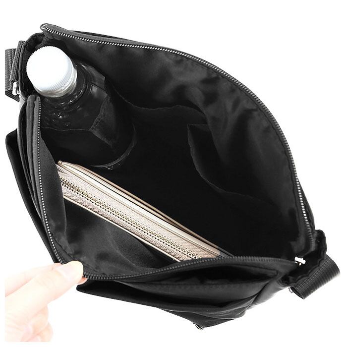 ・メイン収納スペースは、長財布もすっぽり入るサイズ感。小物の収納に便利なオープンポケット×2付き。また500mlペットボトルや水筒も入れられるボトルホルダー付き。