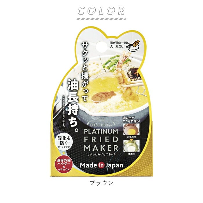 ・小さなおサカナの形だけれどとってもパワフル。ナノプラチナの抗酸化作用が油の酸化を抑えてくれるので、使用後の油の色に違いを実感。