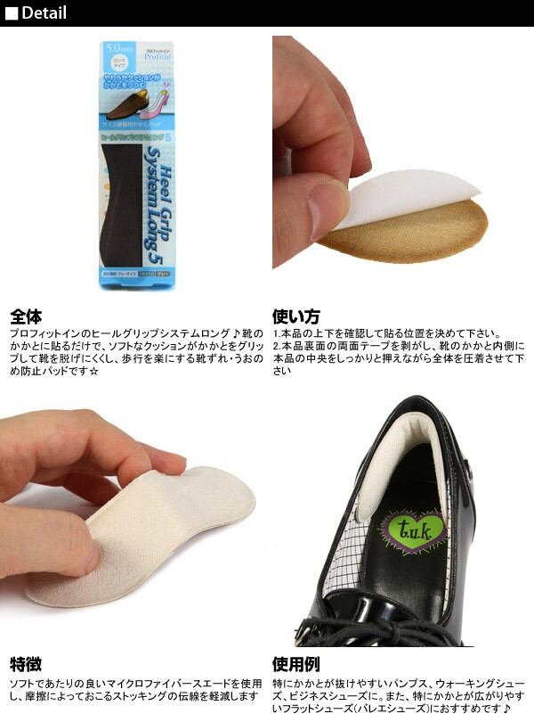 特にかかとが抜けやすいパンプス、ウォーキングシューズ、ビジネスシューズに。また、特にかかとが広がりやすいフラットシューズ(バレエシューズ)におすすめです。