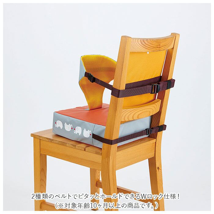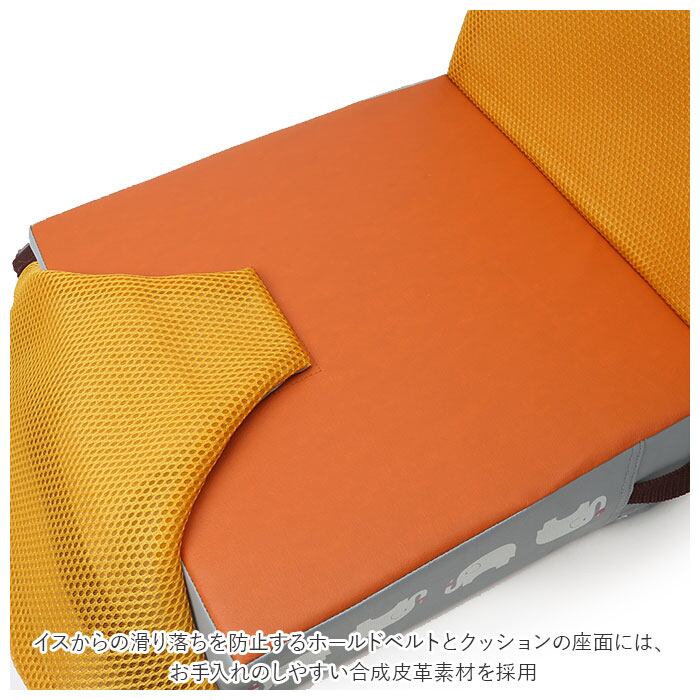 ・イスからの滑り落ちを防止するホールドベルトとクッションの座面には、お手入れのしやすい合成皮革素材を採用。食べこぼしや飲み物の水滴もサッと拭き取れる!