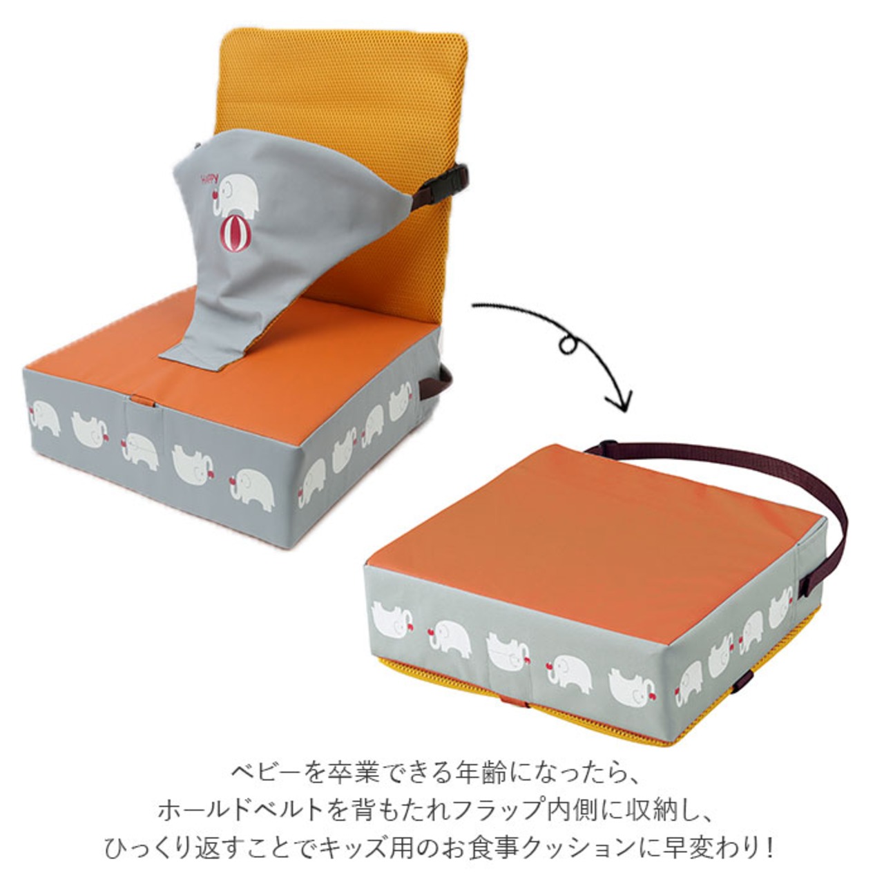 ・ベビーを卒業できる年齢になったら、ホールドベルトを背もたれフラップ内側に収納し、ひっくり返すことでキッズ用のお食事クッションに早変わり!